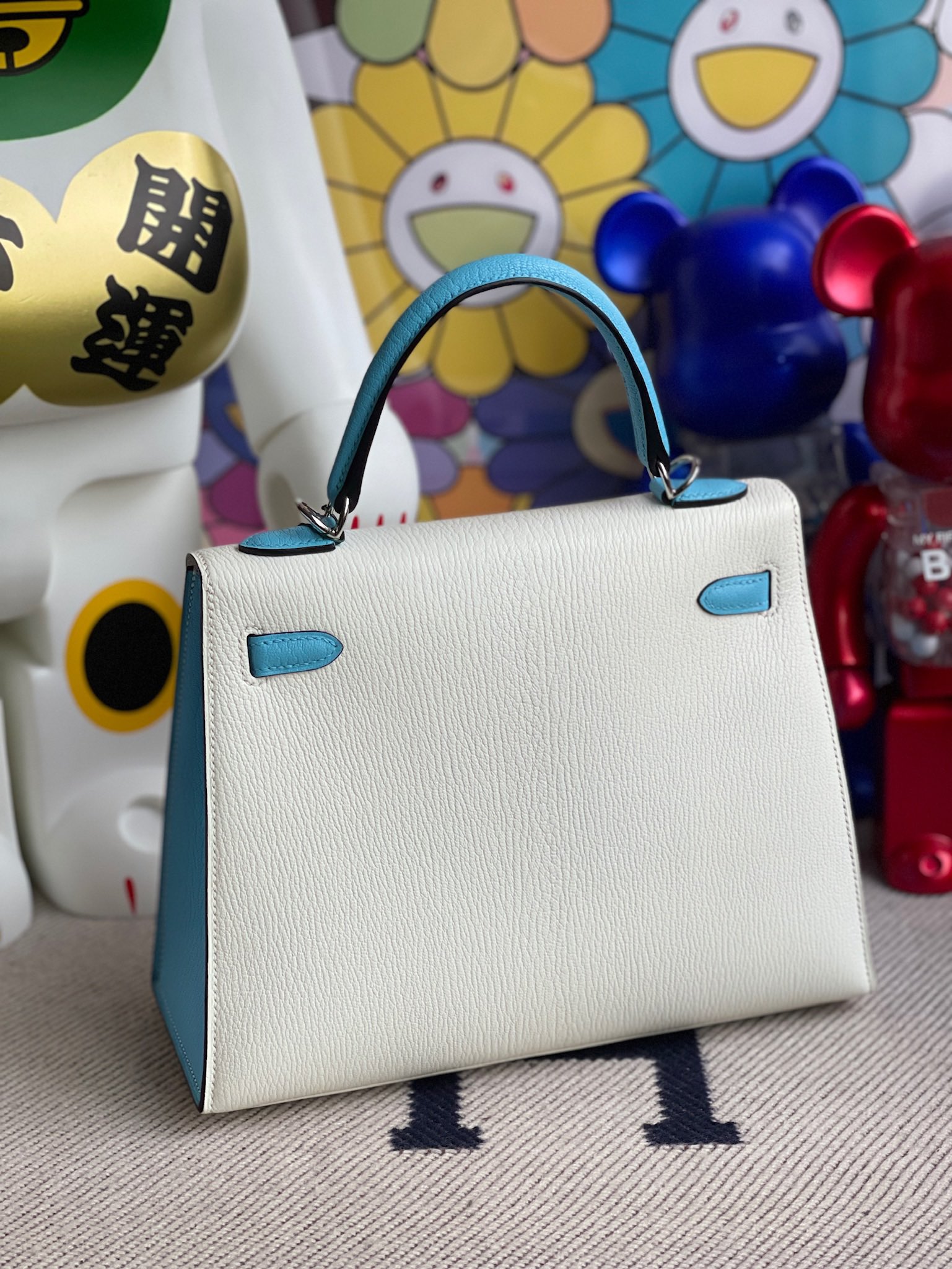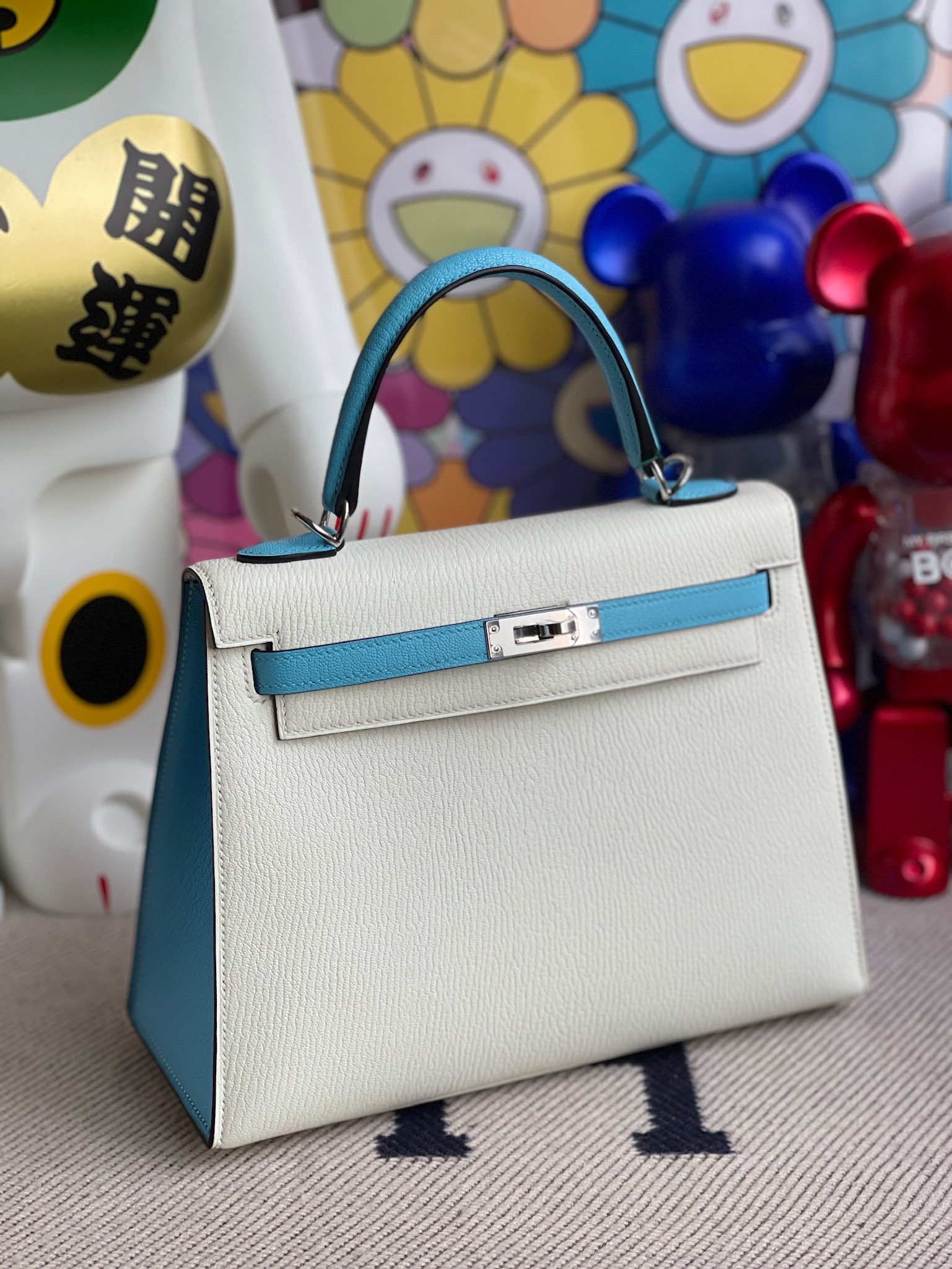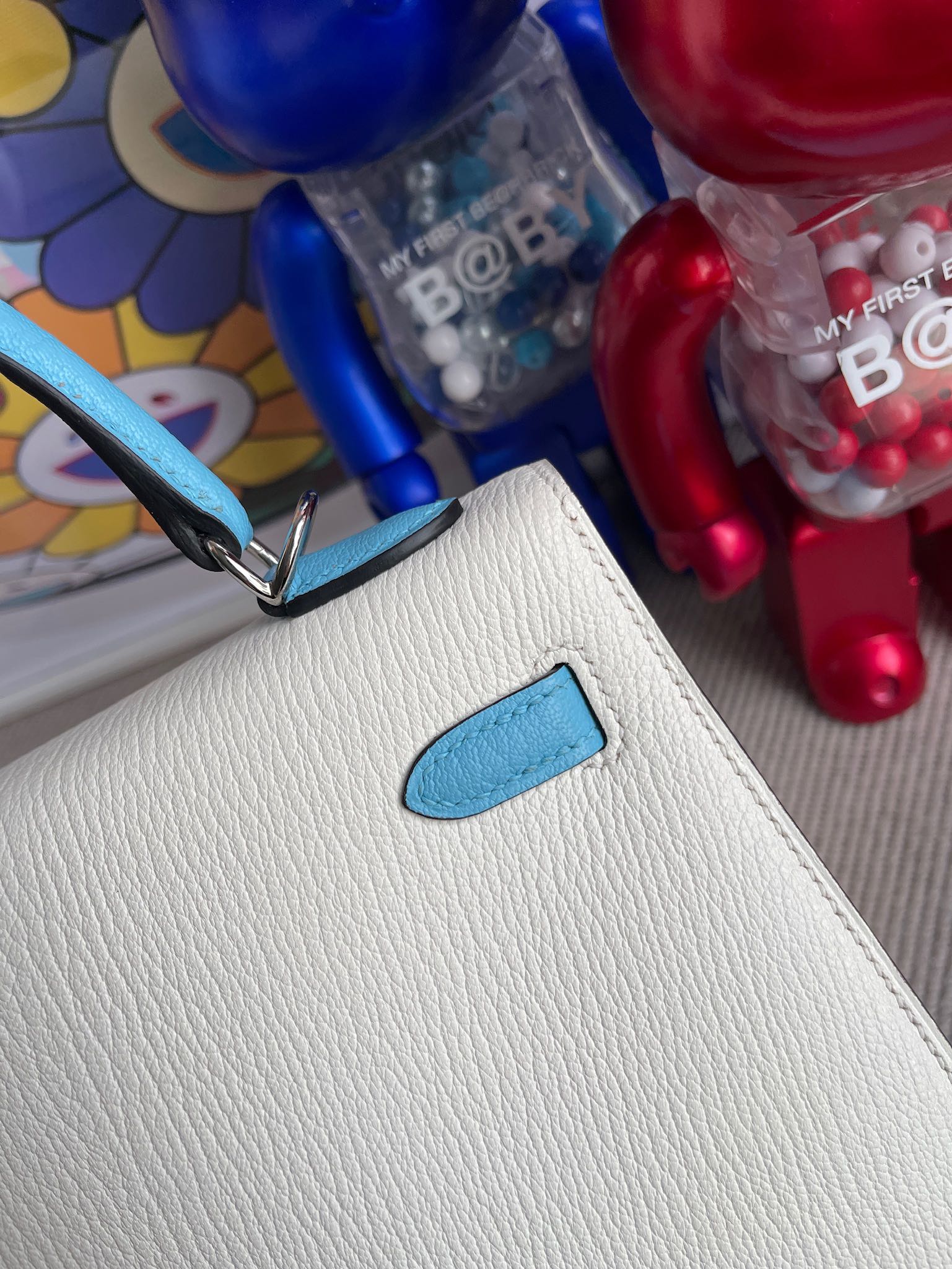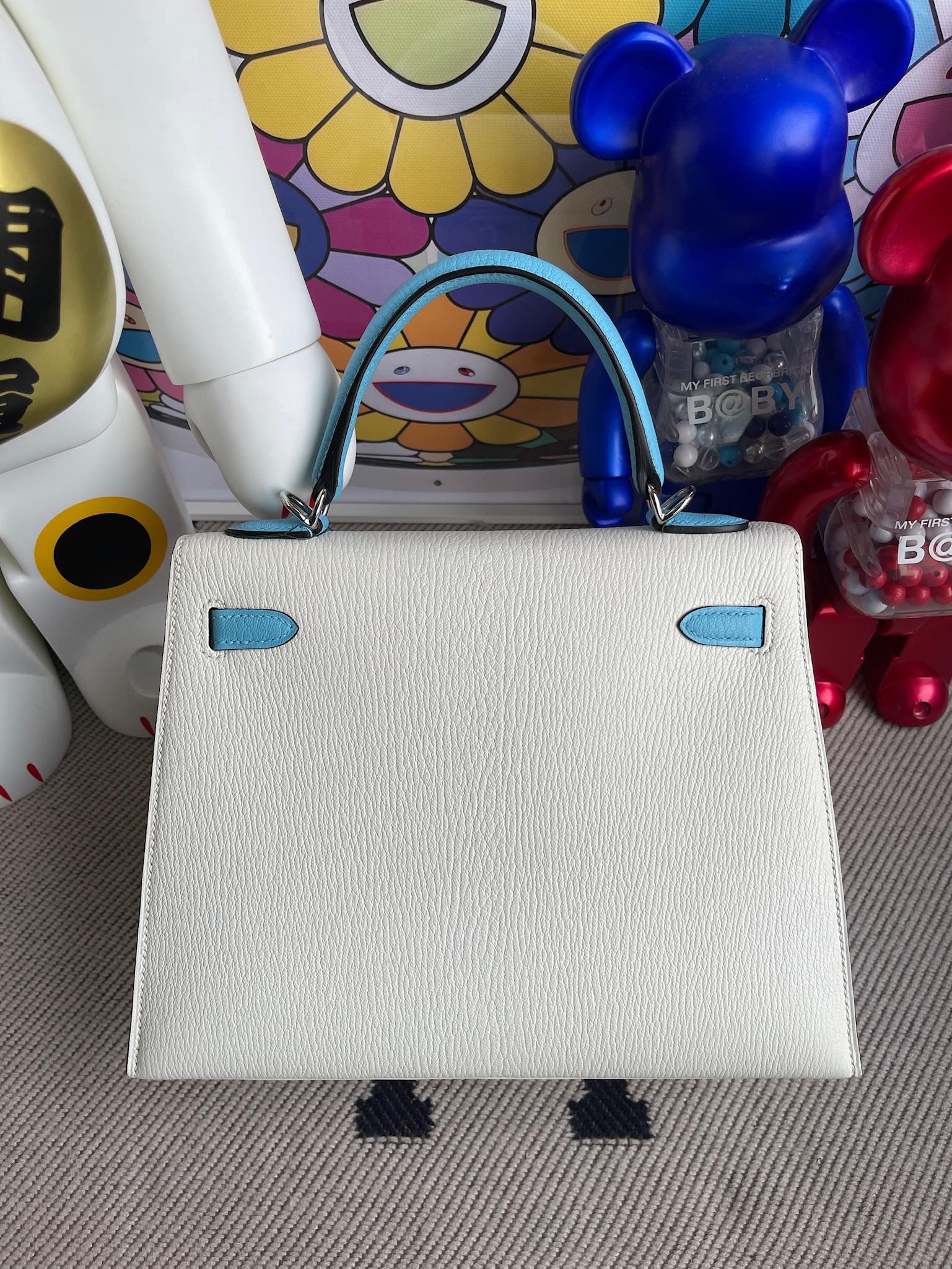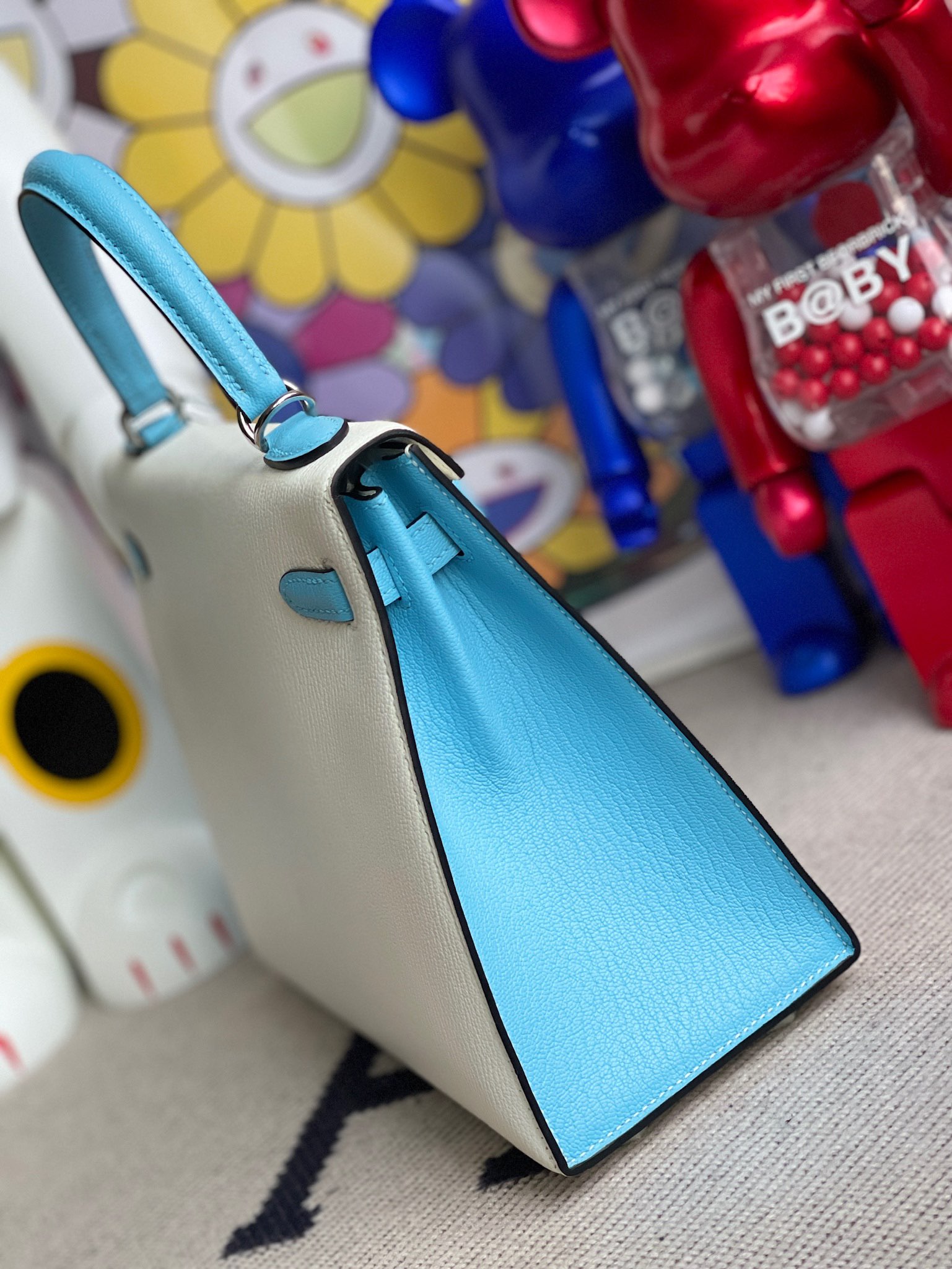 Kelly 25cm Chevre white & Candy blue Silver Hardware Full Handmade