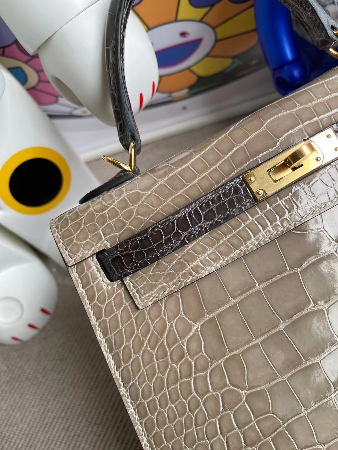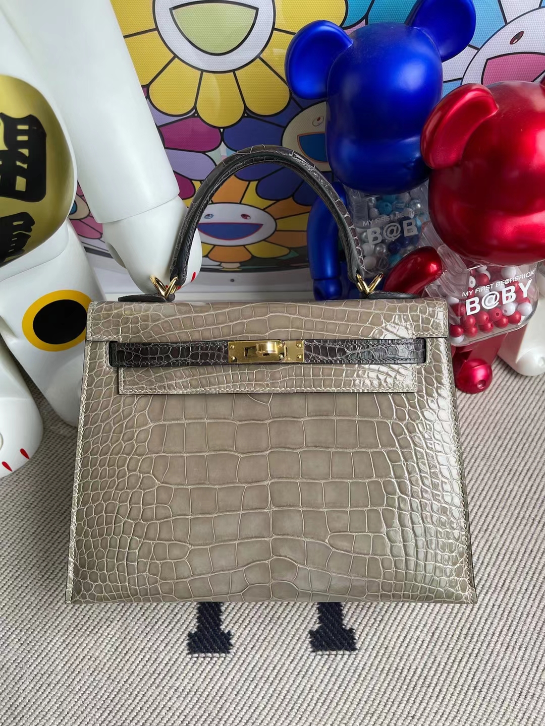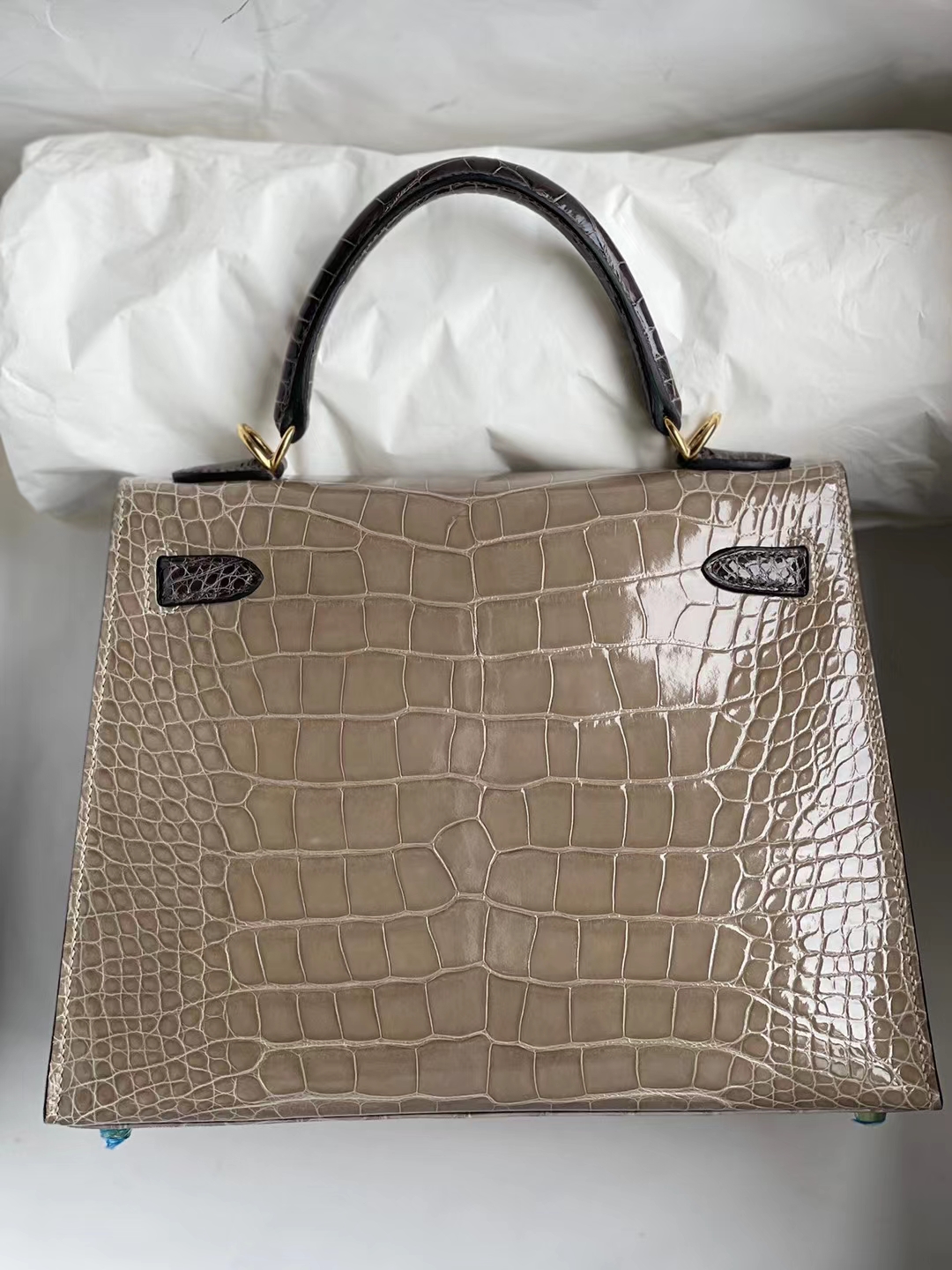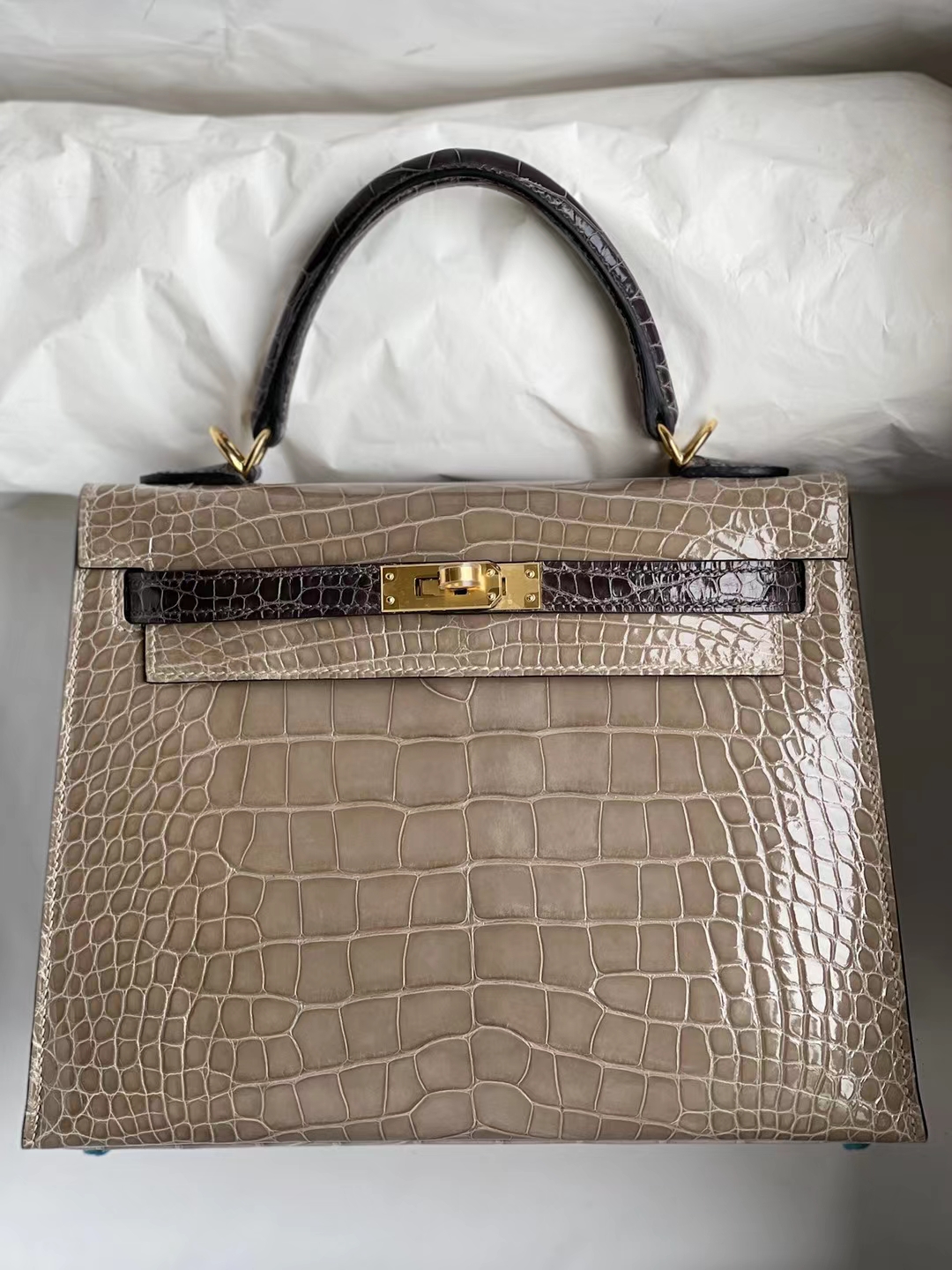 Kelly 25cm shiny alligator Ck81 Gris T & Ck88 Graphite grey Gold Hardware Full Handmade