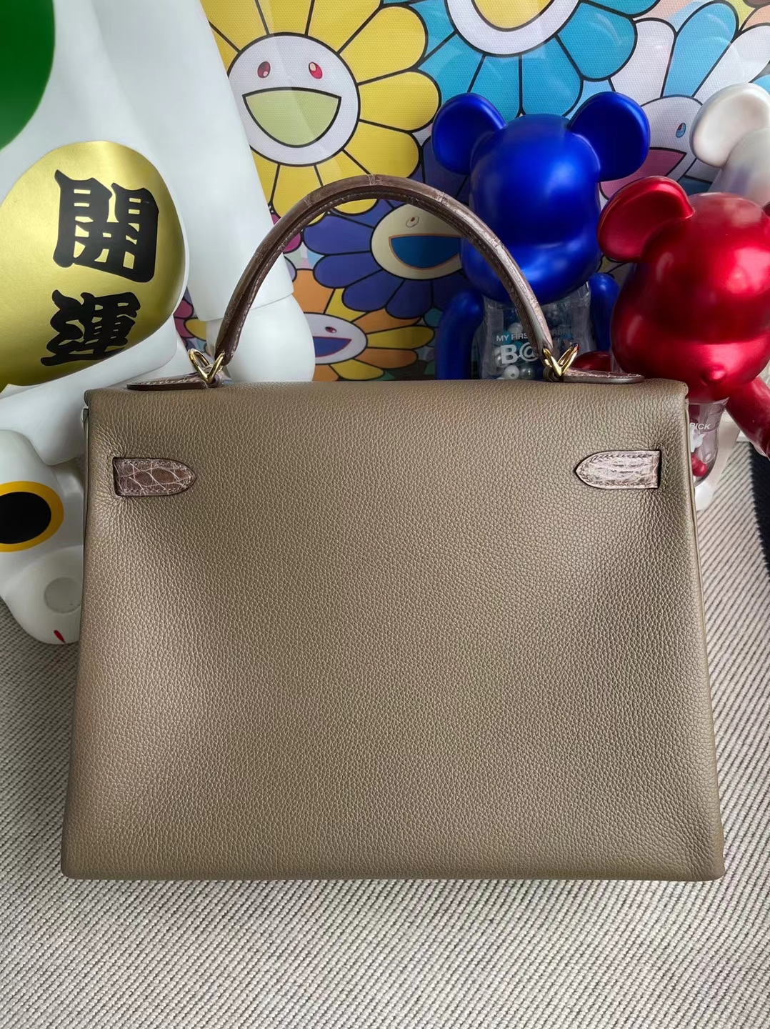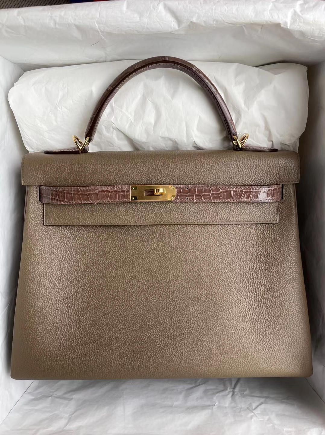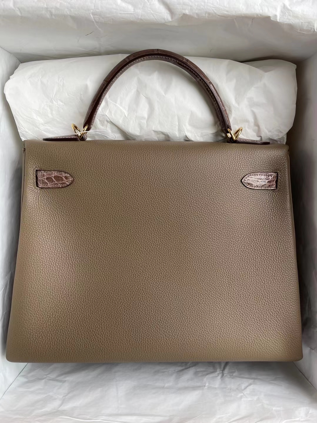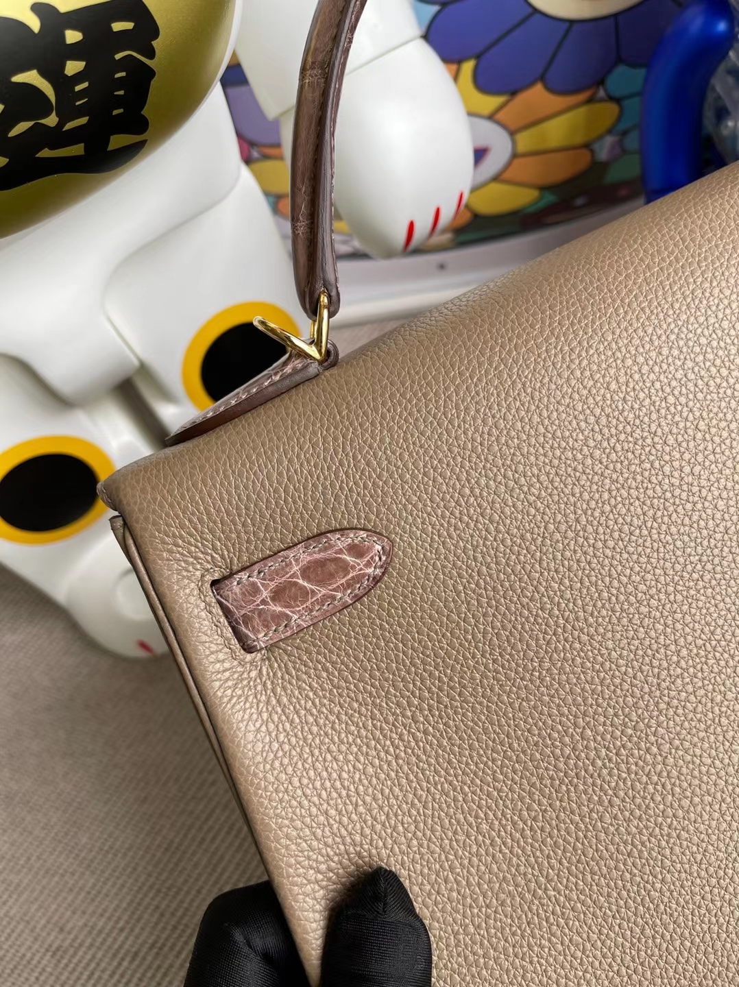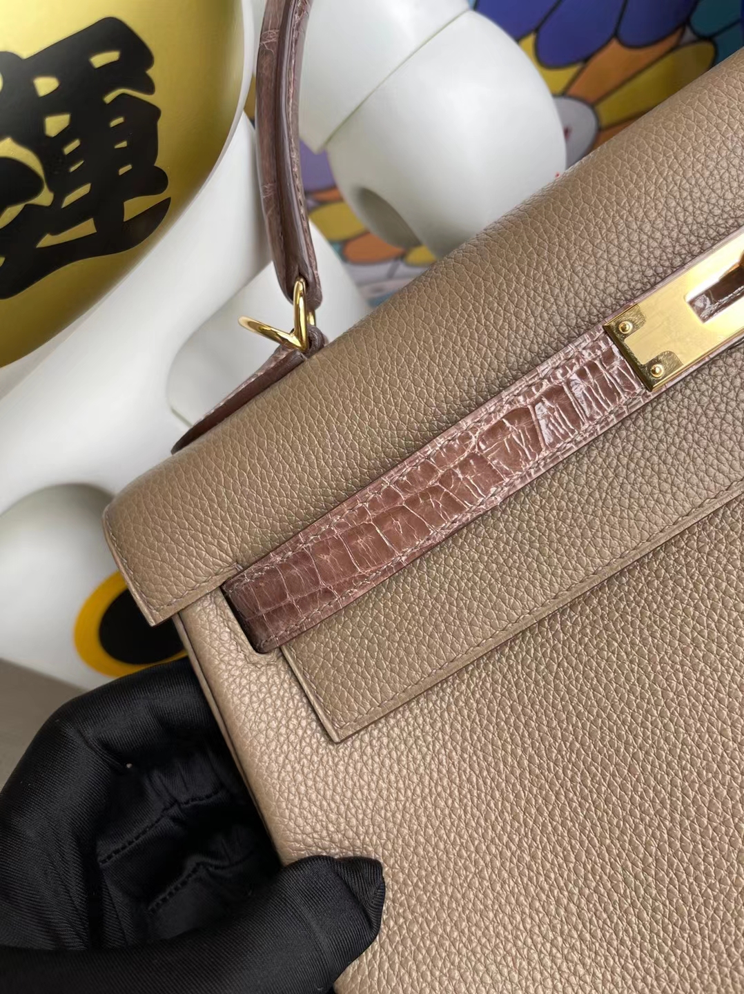 Kelly 32cm Togo & shiny crocodile Ck18 Etoupe Gold Hardware Full Handmade