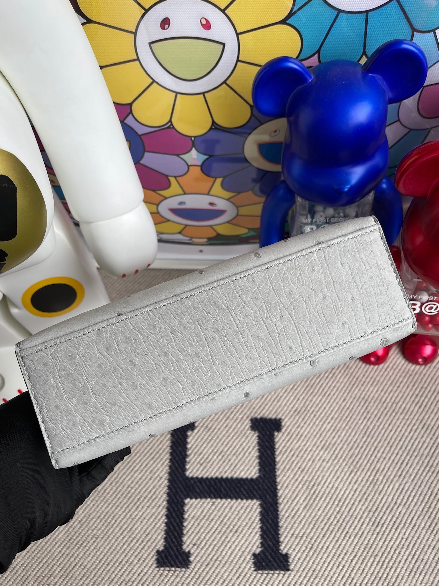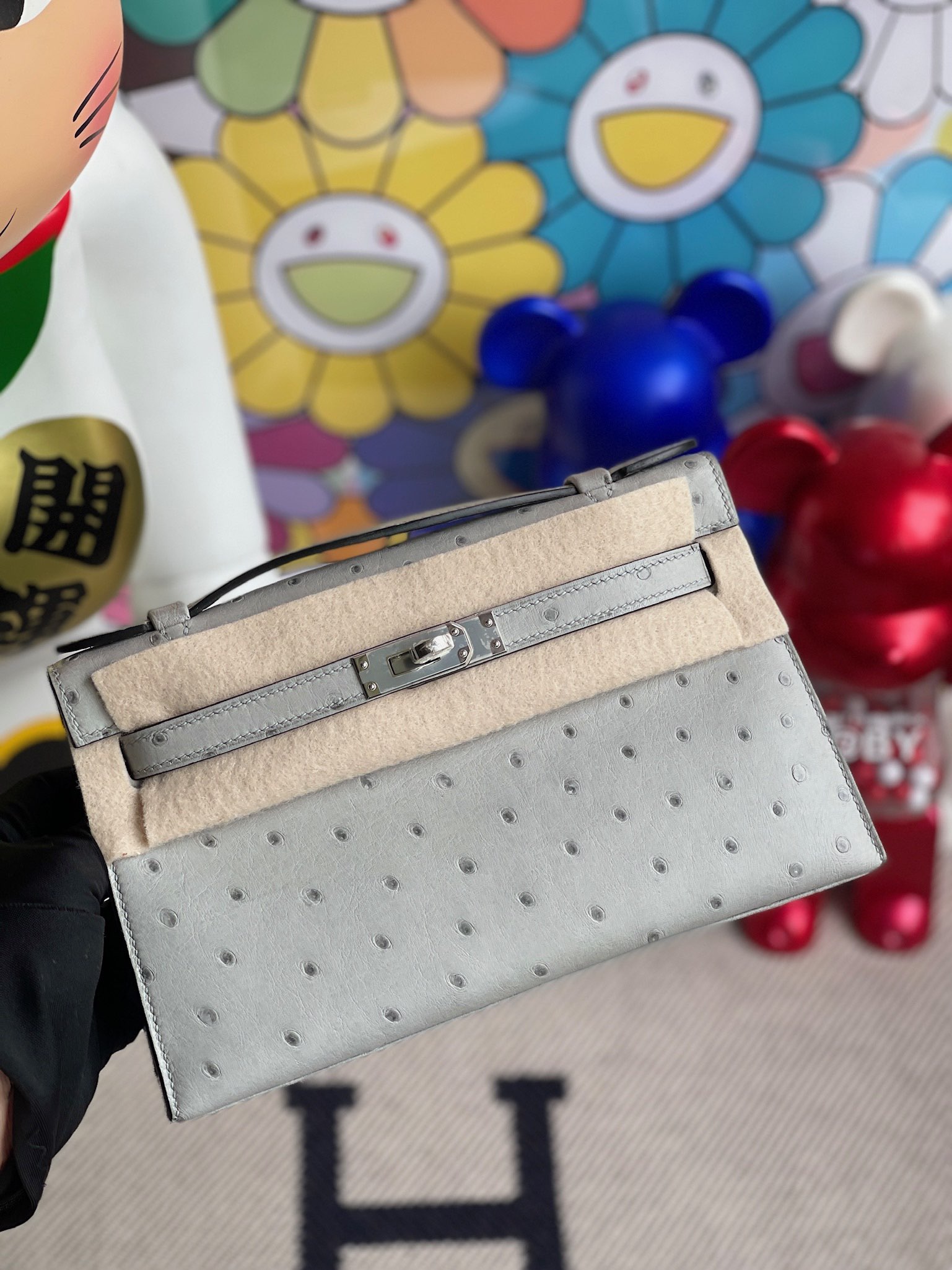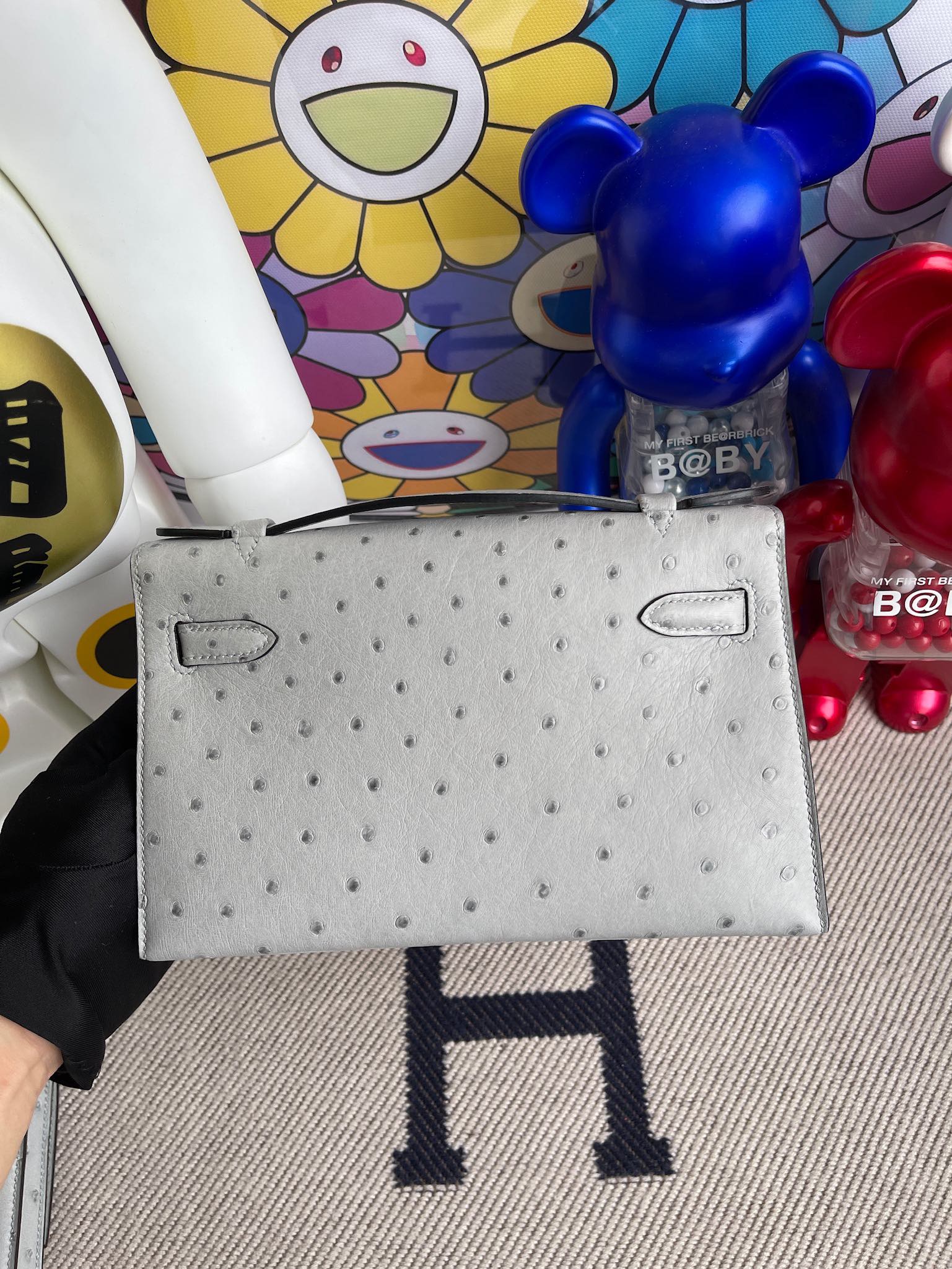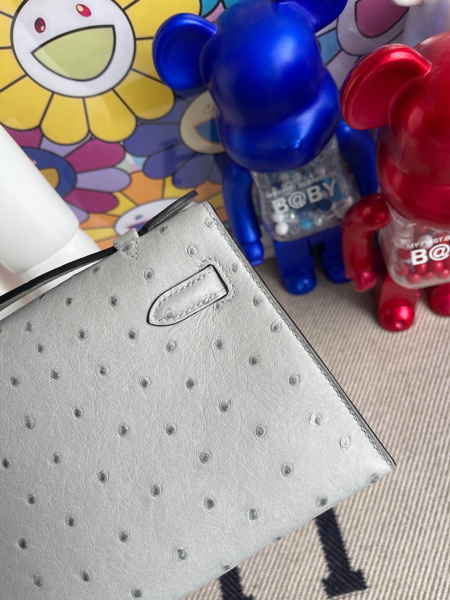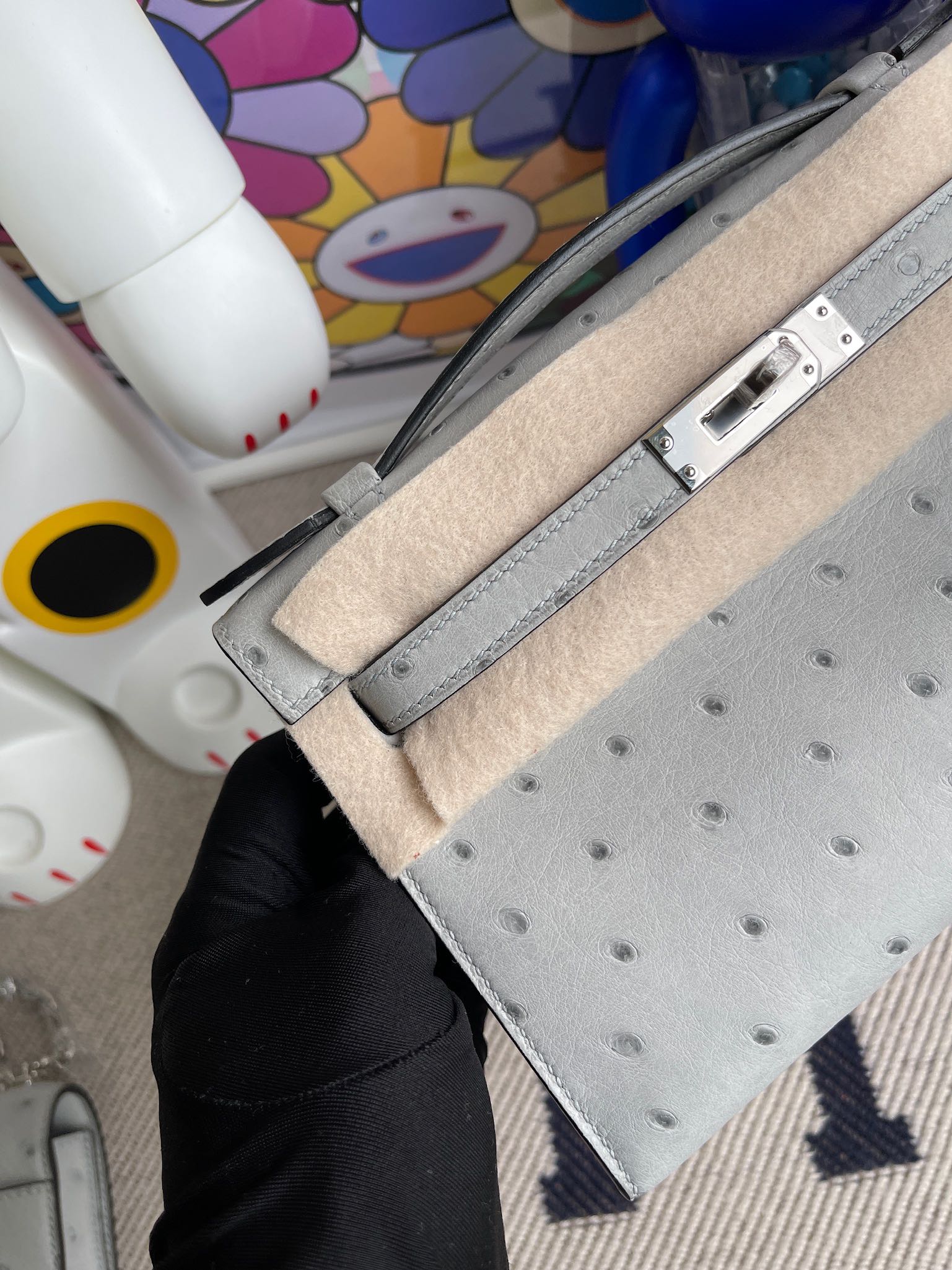 kelly pochette Ostrich kk 8U Glacier Gray Silver Hardware 22cm Full Handmade