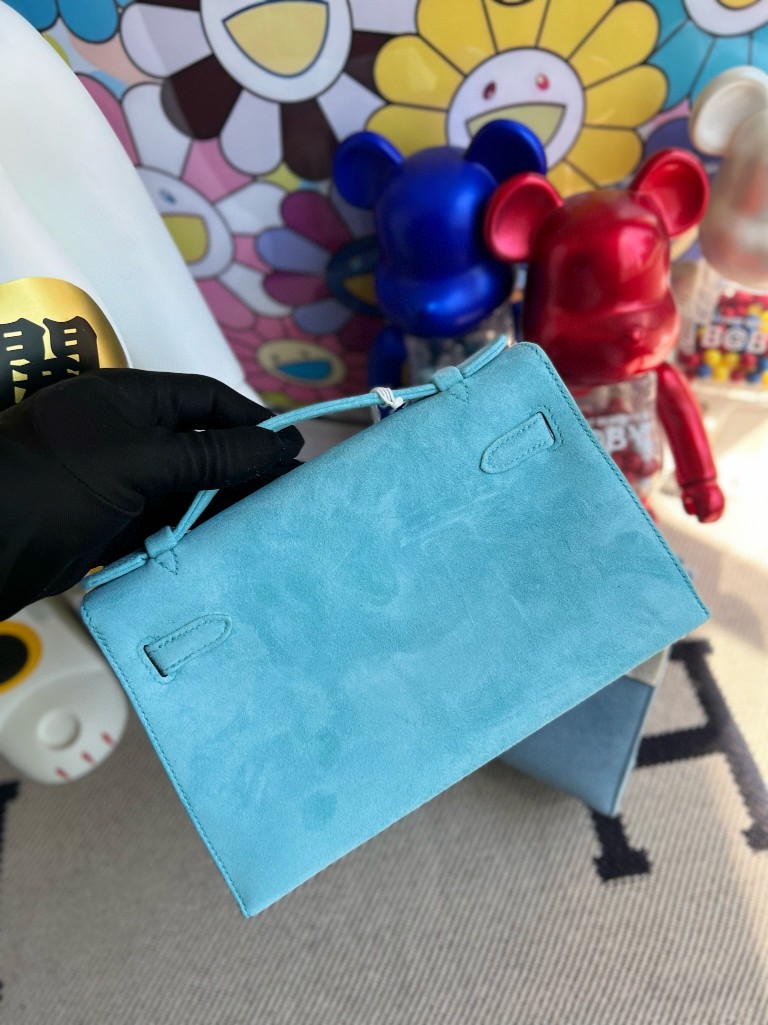 Mini pochette suede chamois macaron blue Gold Hardware 22cm Full Handmade