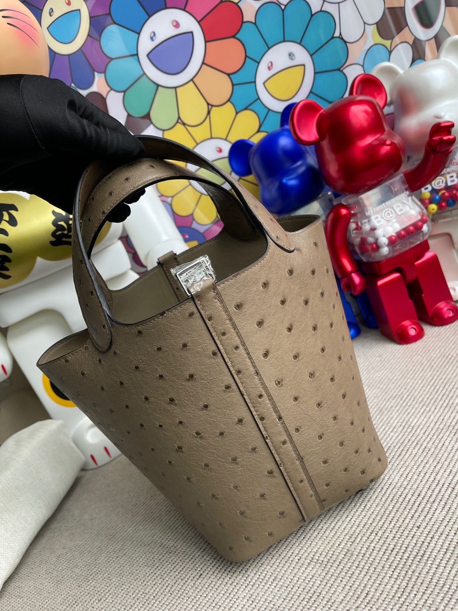 Uncle Bench Hermes Picotin Ostrich kk Etoupe Silver Hardware 18cm Full Handmade